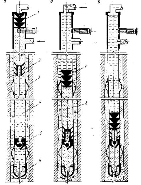 - Retour. Le coulis de ciment est versé immédiatement dans l'espace derrière le tuyau, les solutions de forage et de nettoyage sont expulsées dans la cavité des colonnes.