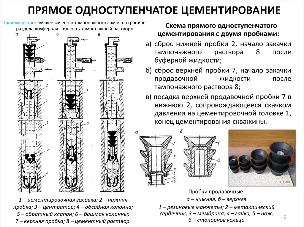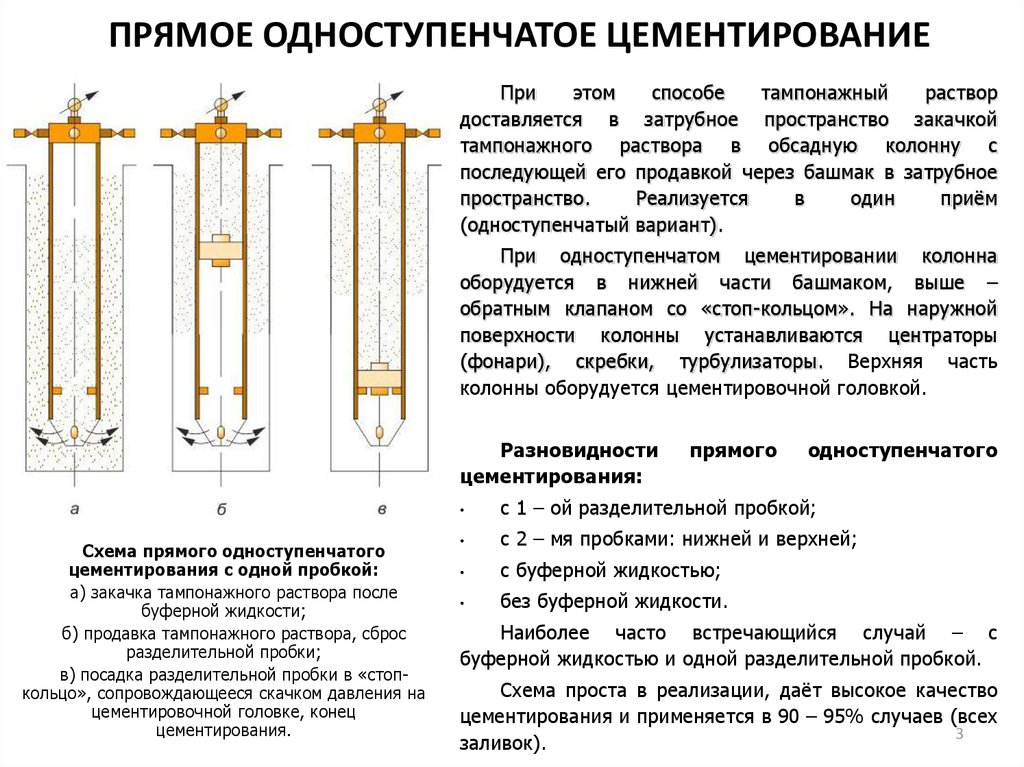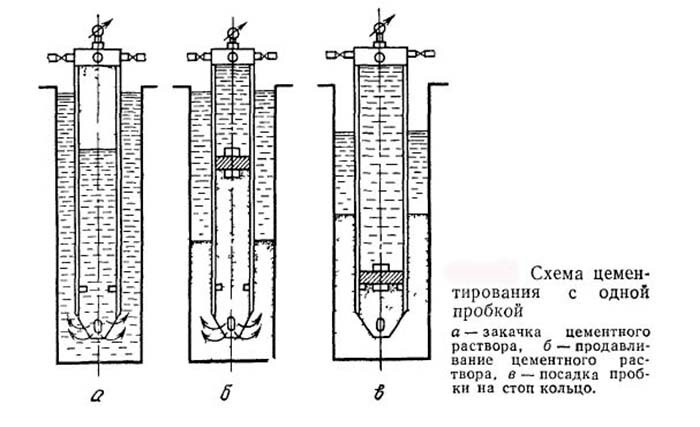 - Méthode en une seule étape. Le mélange de ciment est versé dans la colonne de tubage et bouché avec un bouchon. La solution de lavage est appliquée sur le bouchon. De telles actions conduisent au fait que le ciment est déplacé dans l'espace annulaire