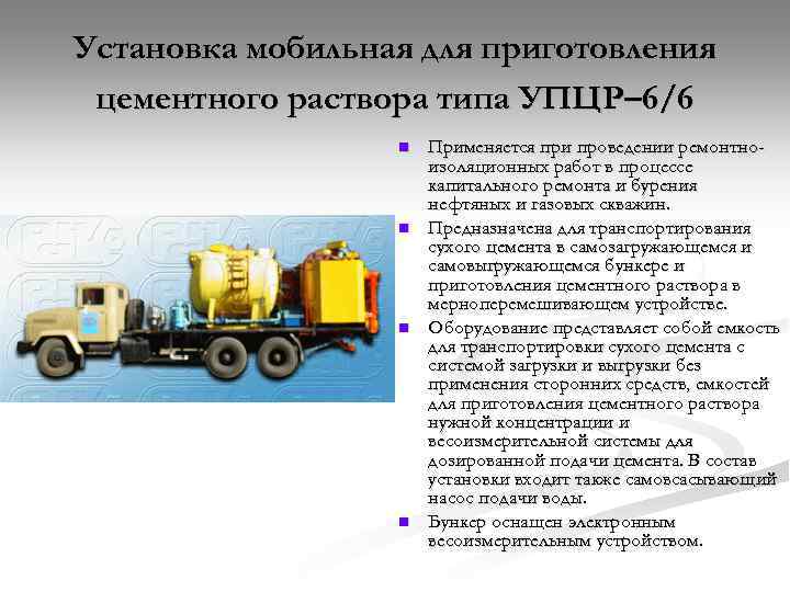 - La composition de ciment finie doit être livrée au puits, car elle se solidifie assez rapidement, le moyen le plus simple est d'utiliser un équipement spécial sur une plate-forme de camion, auquel cas toutes les opérations nécessaires seront effectuées sur place.