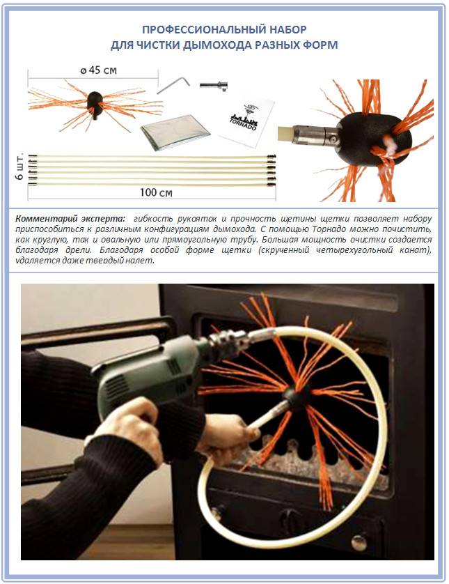 Il est parfois impossible de nettoyer un poêle russe avec une cheminée complexe, comprenant plusieurs virages à un angle de 90 degrés, avec une collerette à travers un tuyau depuis le toit - la longueur d'une telle cheminée est assez grande et la collerette ne s'obstine pas envie de franchir les virages. Dans ce cas, il est possible de combiner le nettoyage des canalisations avec le nettoyage mécanique de la cheminée.