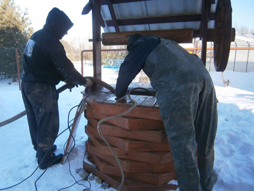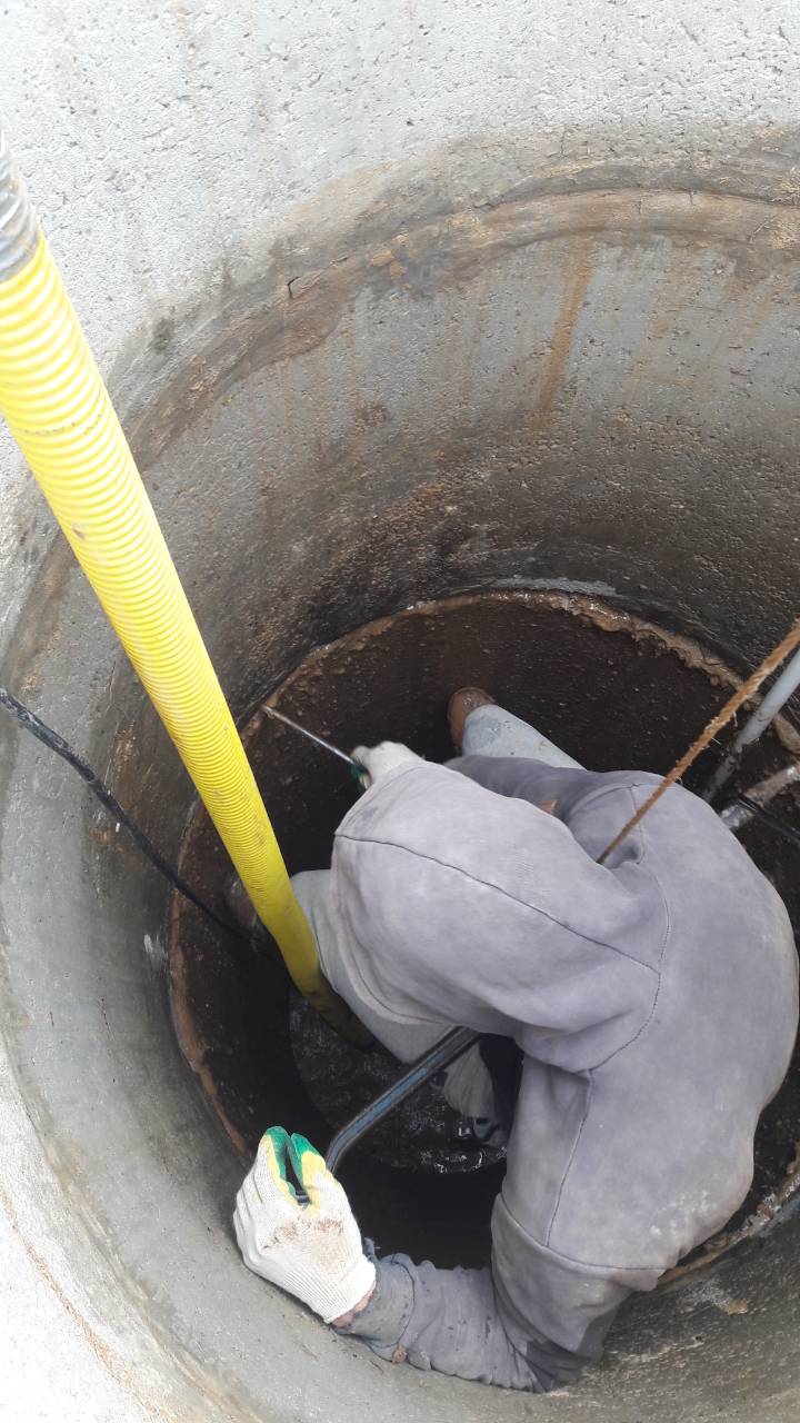 - L'eau est pompée. Cela se fait immédiatement ou par étapes, et au fur et à mesure qu'il est pompé (par exemple, 1 anneau de puits), le nettoyeur descend et lave les parois de la mine.