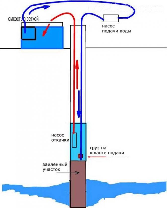Étant donné que le bas du tuyau est situé presque sur le sable, le sable avec de l'eau monte et est absorbé par la colonne montante. La tâche de la personne impliquée dans le nettoyage est de surveiller le niveau d'eau dans le puits.