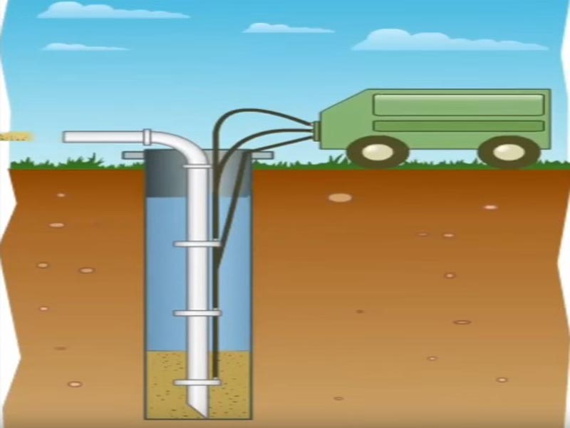 Le nettoyage avec une pompe à air est également un moyen efficace. L'air comprimé est fourni sous pression, au fond du tuyau, le limon, l'eau, les petites pierres montent, sont absorbés par le tuyau et sont poussés à la surface