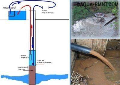 Tout d'abord, une pompe profonde est connectée pour remplir le tuyau d'eau. Ensuite, un externe est connecté, la pression érode la saleté. Le processus se déroule presque automatiquement. Il est nécessaire de surveiller le niveau d'eau dans le baril, d'éteindre périodiquement les pompes pour éviter la surchauffe.