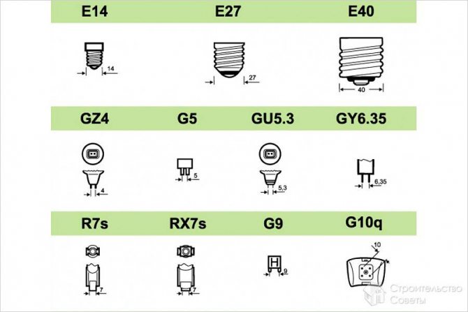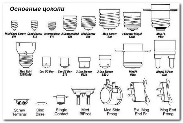 Avec des socles spéciaux - ils sont rarement produits. Mais ils ont le marquage suivant: pour une base avec un contact encastré - (R), une base pour focaliser les lampes - (P), pour les projecteurs - (S) et une base à broches - (B).