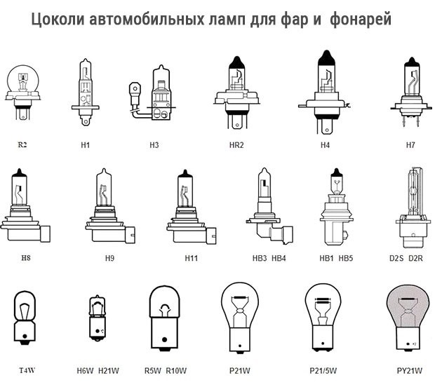 R - une lampe avec un culot métallique de 15 mm et une ampoule de 19 mm. La désignation pour l'exemple (R 5W) est la puissance de 5 watts.R2 - Le diamètre du flacon est d'environ 40 mm.Lampes à incandescence utilisées à l'époque soviétique pour les feux de route et de croisement. Actuellement presque jamais utilisé.P - une lampe avec un culot de 15 mm et un diamètre d'ampoule allant jusqu'à 26,5 mm.