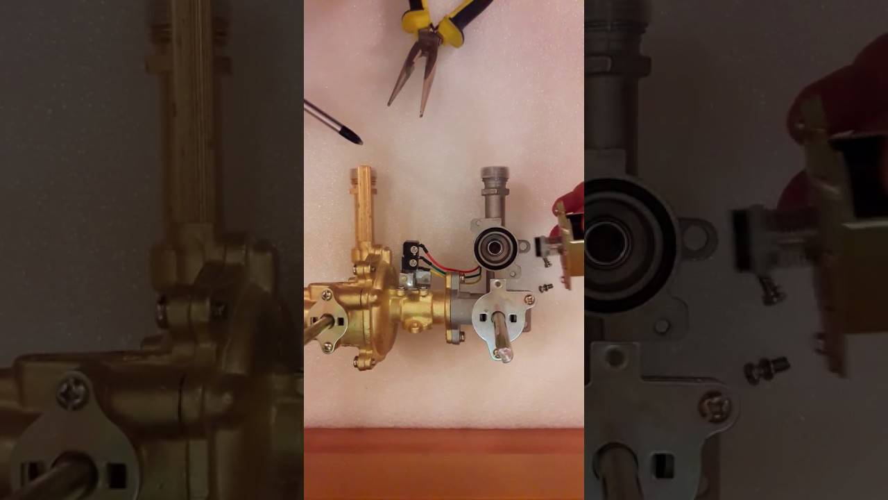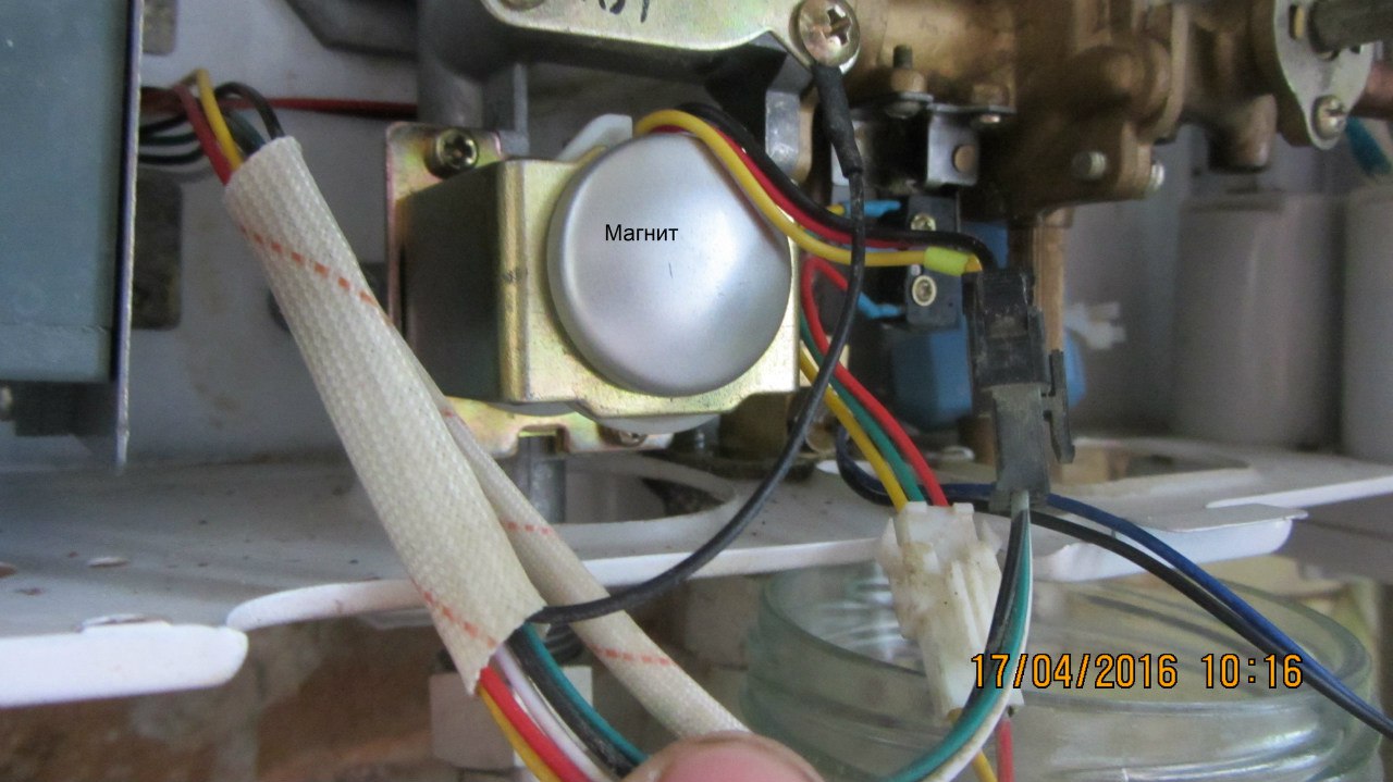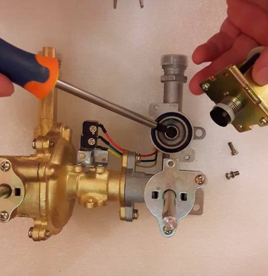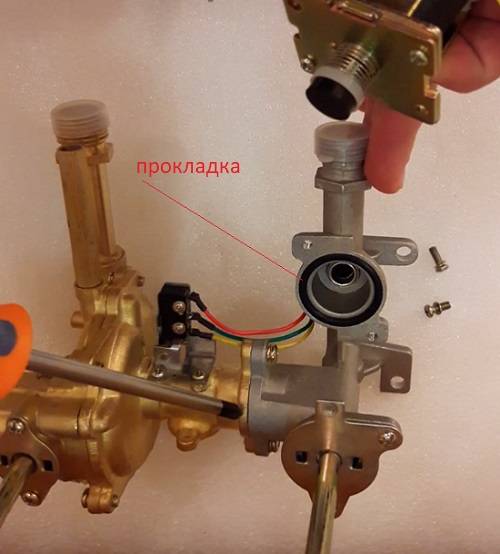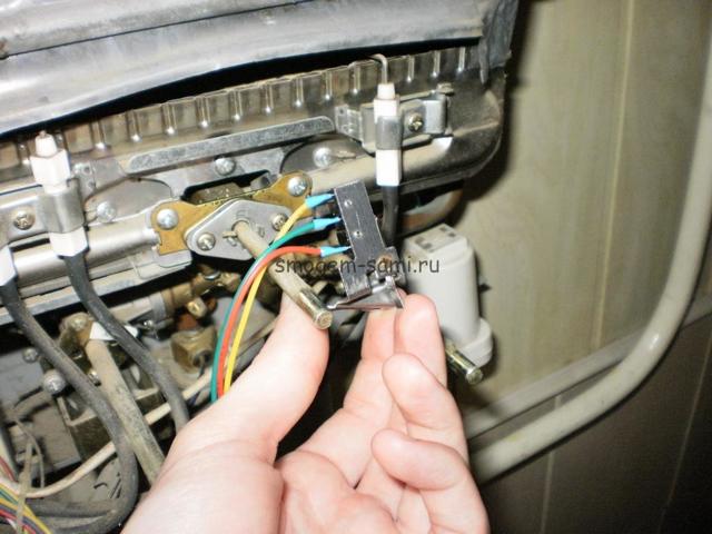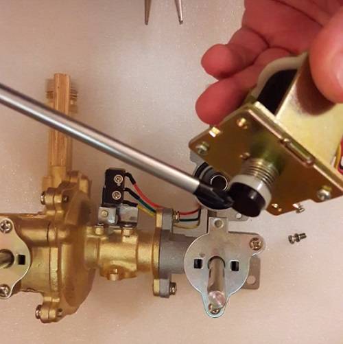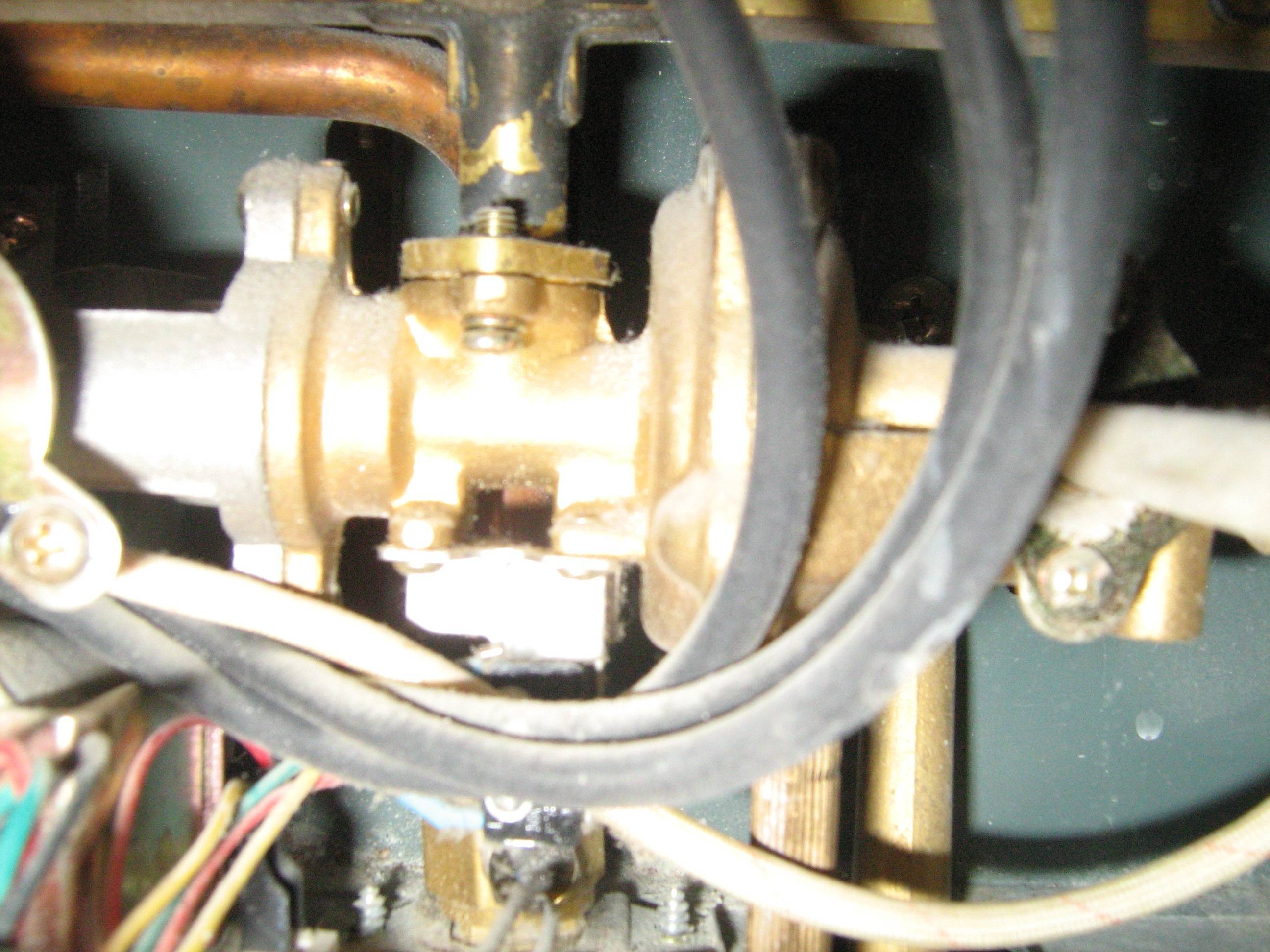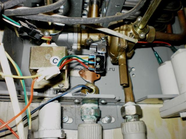 Alors, ouvrez le robinet et voyez ce qui se passe. L'eau bruissait à travers les tubes de l'échangeur de chaleur, les électrodes donnaient une décharge, le ventilateur s'allumait, mais le gaz ne s'enflammait pas. Vérifions si le relais (micro-interrupteur) fonctionne, ce qui fonctionne avec une pression d'eau suffisante et ouvre la vanne d'alimentation en gaz. Pour cela, tournez à nouveau le robinet, la languette du relais doit s'éloigner.