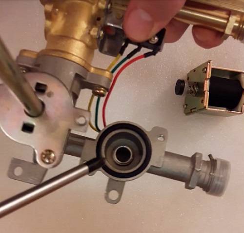 Cela fonctionne, ce qui signifie que la pression est suffisante pour le fonctionnement de la colonne de gaz. Vérifions maintenant le fonctionnement de la vanne gaz. Pour ce faire, utilisez un tournevis pour déplacer la même languette sans ouvrir l'eau. S'il y a une étincelle sur les électrodes et que le ventilateur démarre, la vanne de gaz fonctionne.