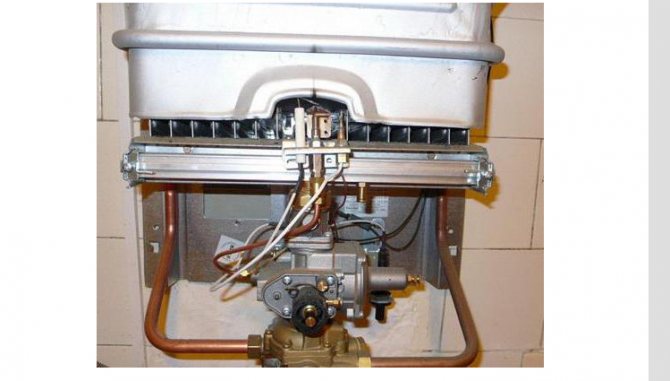 L'élément central de la colonne est un brûleur à gaz, dans lequel la combustion du gaz est entretenue, ce qui contribue à chauffer l'eau. Le brûleur est installé dans le boîtier, il collecte les produits de combustion chauds dont le but est de chauffer l'eau.