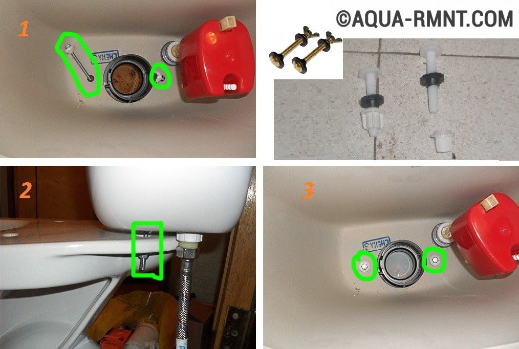 Fuite par les vis de connexion. Dans la plupart des cas, ils surviennent à la suite d'une mauvaise installation de la cuvette des toilettes ou à cause de joints secs. Comme dans le cas précédent, dévissez les vis, mais ne retirez pas le réservoir. Nous prêtons attention aux joints, ou plutôt à leur forme - si nous parlons de rondelles plates en caoutchouc, nous les jetons et allons au magasin pour un nouveau kit permettant de connecter le réservoir aux toilettes. Lors de l'achat, assurez-vous qu'il est équipé de joints coniques, car ils assurent une étanchéité plus fiable des trous.Nous installons un nouveau kit de montage conformément au schéma suivant. Plus près de la tête de vis, nous mettons d'abord une rondelle métallique - suivie d'un joint conique avec une partie étroite de la tête de vis. Nous insérons la vis dans le trou (de l'intérieur du réservoir) et par le bas, sous la cuvette des toilettes, mettons un élastique plat, puis une rondelle et vissons l'écrou. Vous devez serrer les boulons un par un - serrez d'abord l'un, puis l'autre, puis revenez au premier et passez au second. En général, vous devez vous assurer que le réservoir tombe uniformément sur les toilettes - l'inclinaison peut entraîner une fissure sur les toilettes ou le réservoir.