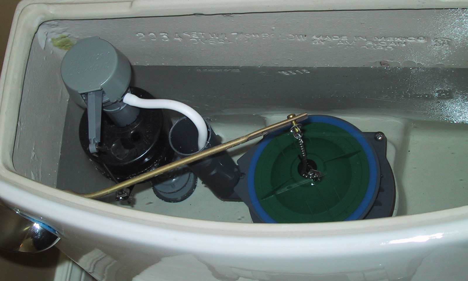 La conception des raccords de remplissage comprend un clapet d'admission 5 du type tige. Son fonctionnement est commandé par le flotteur de la cuvette des toilettes 3, agissant sur la tige de coupure par l'intermédiaire d'une bascule en laiton. Un système similaire est appelé vanne à flotteur et est toujours utilisé sous une forme légèrement modifiée.