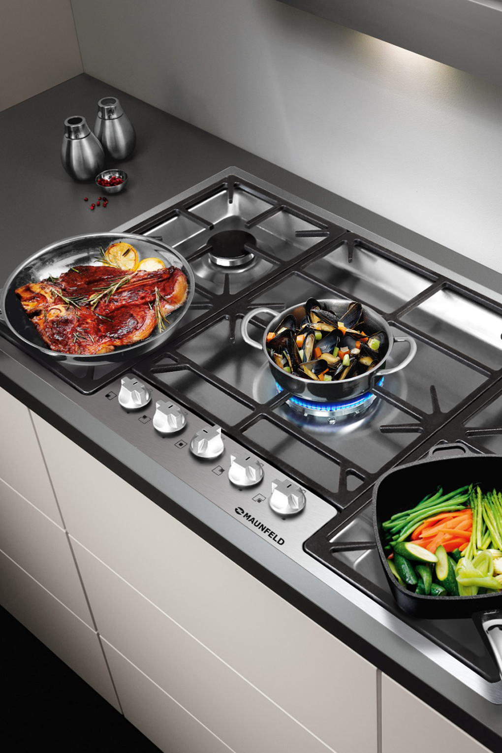 Les plaques de cuisson minces sont intégrées au plan de travail et ne "mangent" pas beaucoup d'espace utile dans la pièce. Même dans une cuisine de petite taille, ils sont idéalement placés et rendent le processus de création de plats quotidiens et festifs agréable, facile et confortable. Il y a plus d'espace libre dans la pièce et l'espace ne semble pas surchargé.