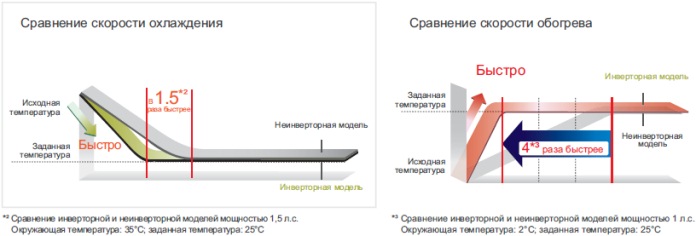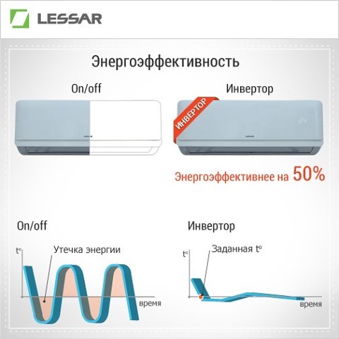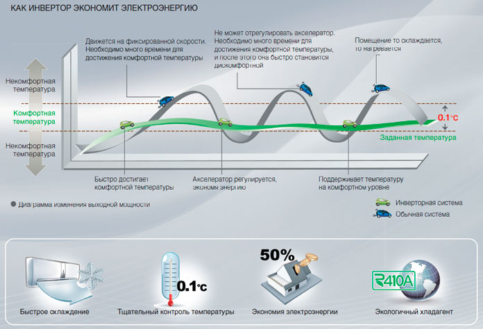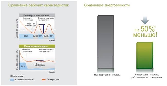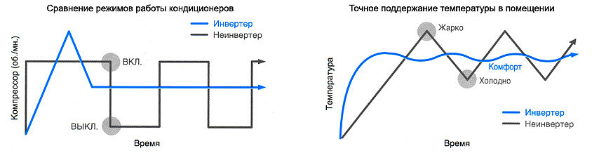 Dans notre réalité, lorsque nous partons travailler le matin, nous éteignons le climatiseur. Le soir ou la nuit, allumez-le pendant plusieurs heures. Dans le même temps, un système d'onduleur moderne et un système conventionnel fonctionneront presque de la même manière pendant cette courte période de temps, à des modes maximaux.