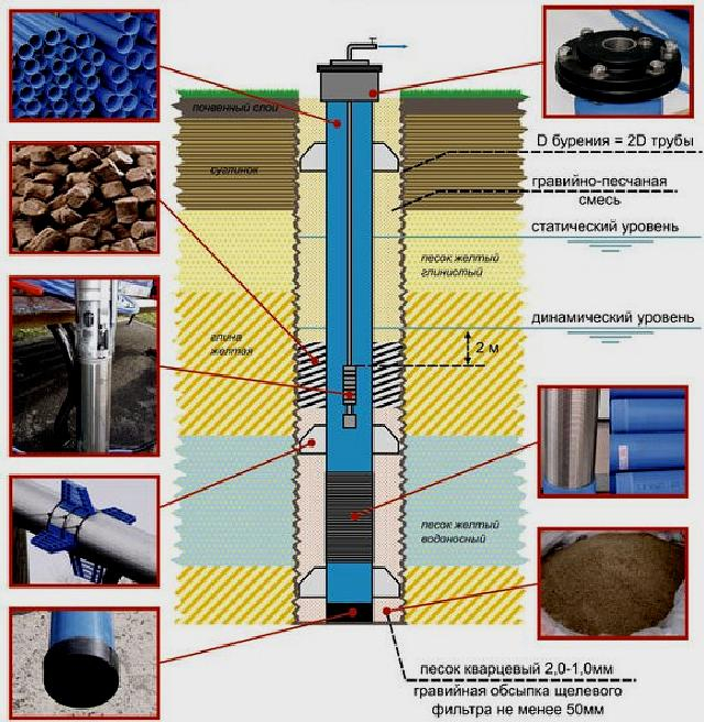 Si l'aquifère est situé à une profondeur de 10 à 50 m dans la couche sableuse, alors un filtre, ou puits sableux, est équipé. Il se compose de plusieurs éléments :