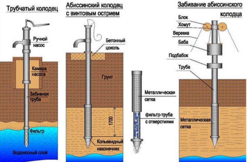 Puits à aiguilles ou puits abyssin - la profondeur atteint de 4 à 12 mètres. L'eau n'est pratiquement pas différente d'un puits. Il n'y a pas d'insectes ou d'objets étrangers dans le puits. Il peut être marqué en seulement 1 jour. Pour ce faire, un tuyau pointu est enfoncé dans le sol, qui ne pourra pas manquer l'eau supérieure. Pour la construction, vous aurez besoin d'une pompe aspirante pour la prise d'eau. Le puits est souvent aménagé dans les sous-sols. Dans un tel endroit, la source sera sous pression constante. Il n'a pas besoin de nettoyage supplémentaire. Tous les types de sol ne conviennent pas à un forage réussi. Une utilisation constante est nécessaire, sinon un envasement se produira.