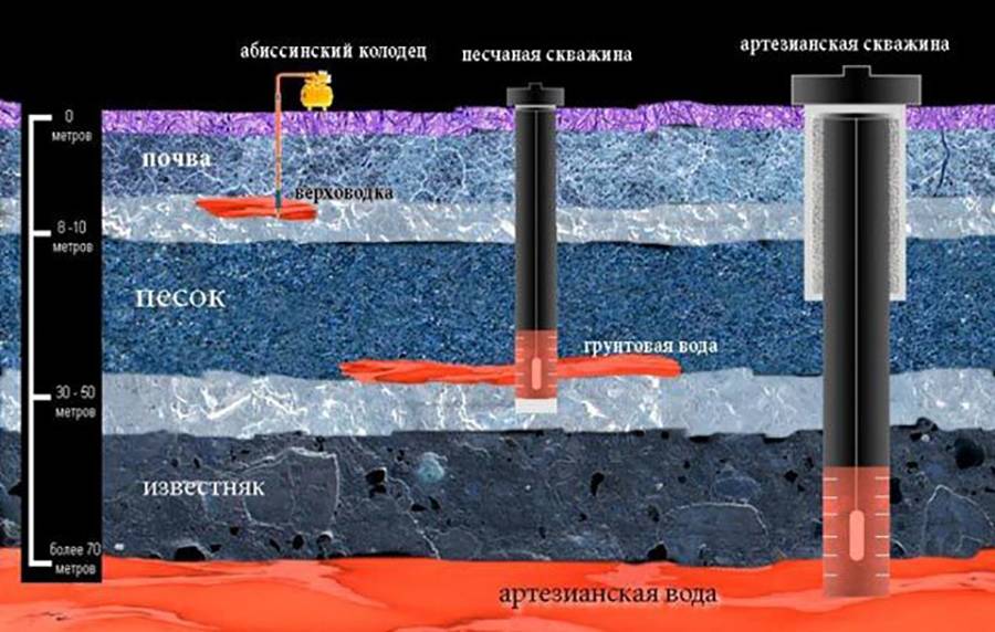 La profondeur d'un tel puits atteint 30 mètres et est réalisée sur un sol sablonneux. Lorsque vous choisissez quel est le meilleur puits abyssin ou puits de sable, vous devez savoir que la durée de vie d'un tel puits est limitée à un maximum de 15 ans, mais en pratique, elle est généralement de 5 à 7 ans.