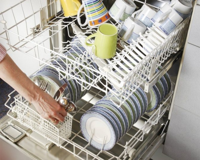 - Chargement. Vous devez d'abord placer toute la vaisselle sale à l'intérieur de l'appareil. Dans ce cas, les couteaux, cuillères et fourchettes doivent être posés strictement en position horizontale. Dans la plupart des modèles, un bac spécial est prévu à cet effet.