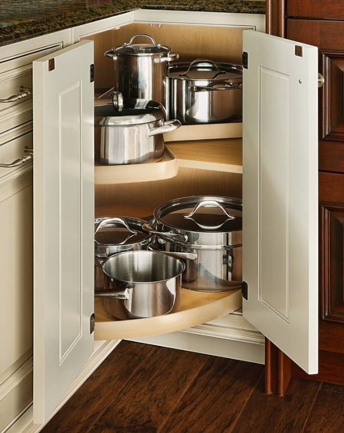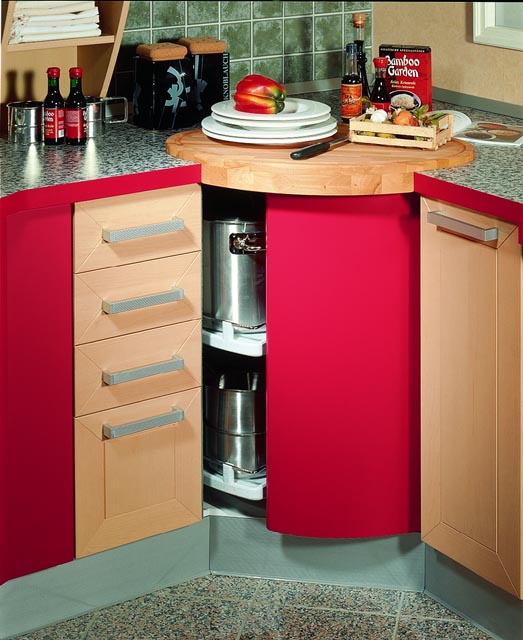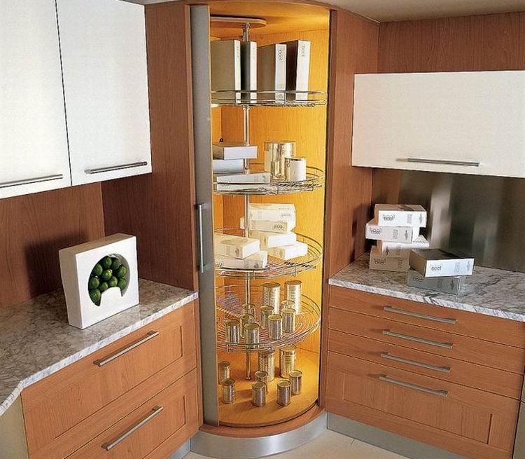Les meubles d'angle sont non seulement assez compacts, mais aussi spacieux. Après tout, tous les coins qui ne sont pas pris en compte dans les ensembles de cuisine standard sont concernés. Un espace supplémentaire peut également être obtenu en utilisant des étagères pivotantes et coulissantes.