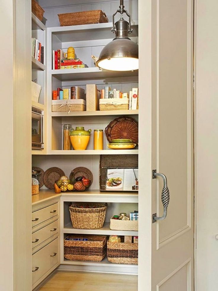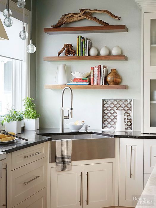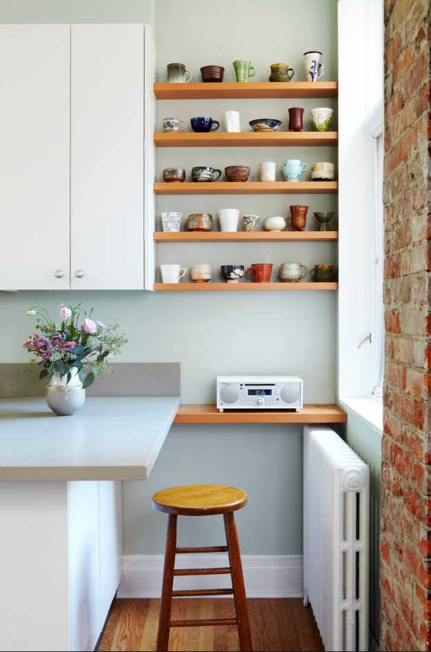 Vous pouvez agrandir visuellement la pièce en remplaçant les tiroirs supérieurs par des étagères ouvertes. Vous pouvez, au contraire, aménager la cuisine, en résolvant en même temps le problème du stockage.