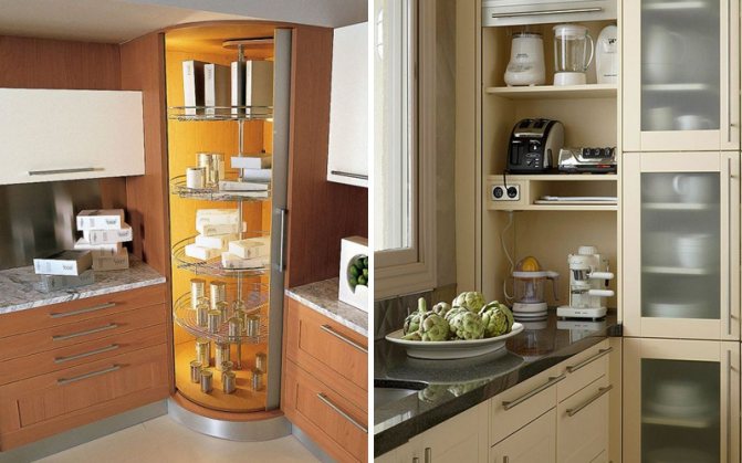 Si la cuisine ne dispose pas de suffisamment d'espace pour stocker de grands plats, vous pouvez organiser une niche supplémentaire avec des portes. Rappelez-vous simplement comment placer les étagères à l'intérieur. Cette règle est pertinente si un radiateur de chauffage est installé sous la fenêtre. S'il n'y en a pas, il est même possible d'organiser un casier avec des tiroirs.