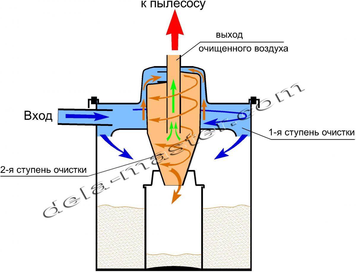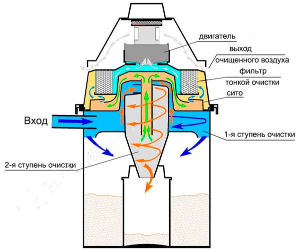 - Dans les cyclones du premier type, l'air se déplace en spirale, où, sous l'influence de la force centrifuge, il colle aux parois, perd de la vitesse et se dépose immédiatement, restant dans le réservoir lui-même. Ensuite, l'air traité passe à travers le moteur et les filtres en mousse et est expulsé.