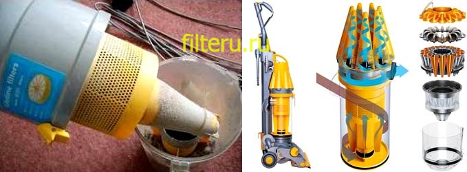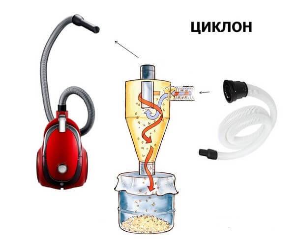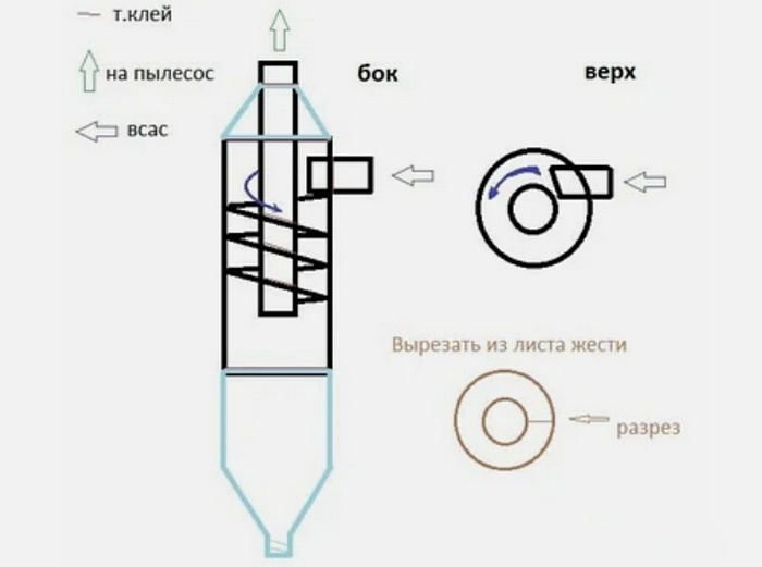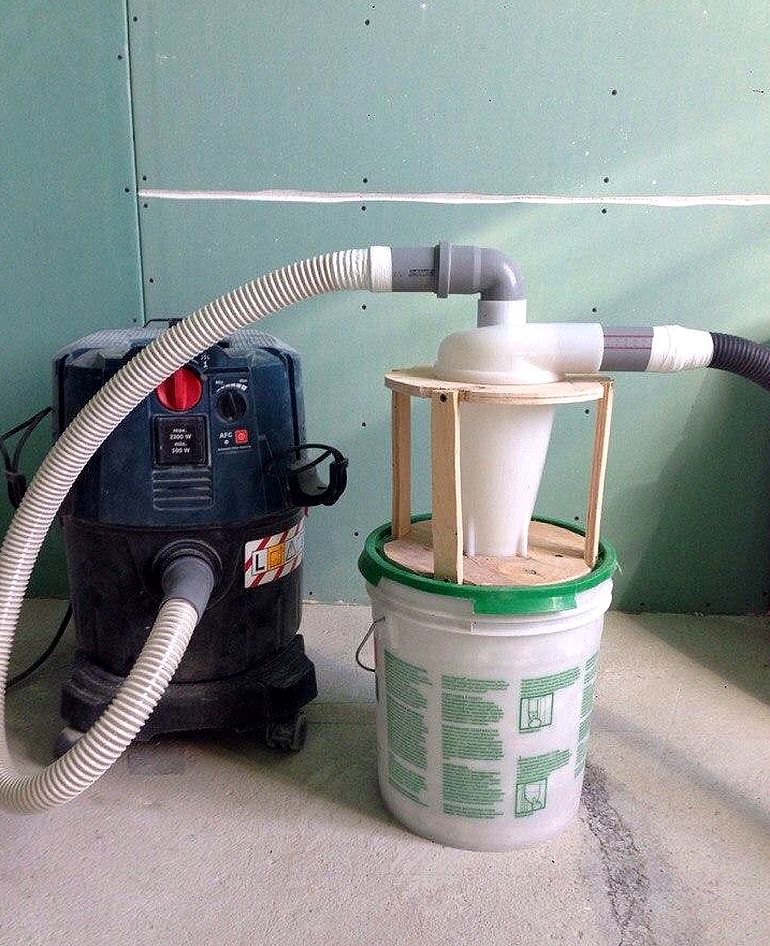 Cependant, certains utilisateurs avancés utilisent une conception similaire faite maison. Dans la plupart des cas, de vos propres mains, un accessoire de cyclone externe est fabriqué pour un vieil aspirateur (par exemple, le cyclone de l'URSS).Il est assemblé à partir d'un seau en plastique avec un couvercle scellé et des tuyaux de raccordement. Des trous sont pratiqués dans le seau selon un certain modèle, dans lequel des composants de connexion sont insérés. Il est facile de trouver un schéma de l'appareil sur Internet.Certains fabricants produisent des dispositifs de filtrage externe selon le principe du cyclone pour les aspirateurs ordinaires, qui permettent de collecter les ordures en gros volumes. Cela est particulièrement vrai lors de la collecte des ordures lors de travaux de réparation ou de construction.