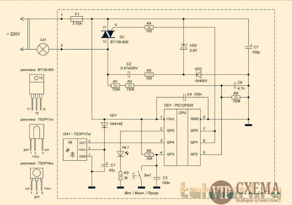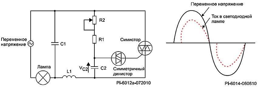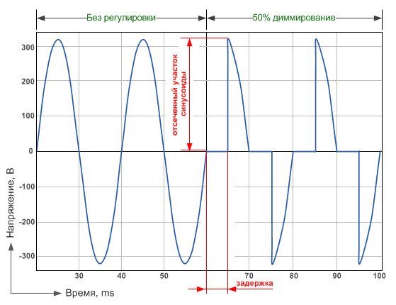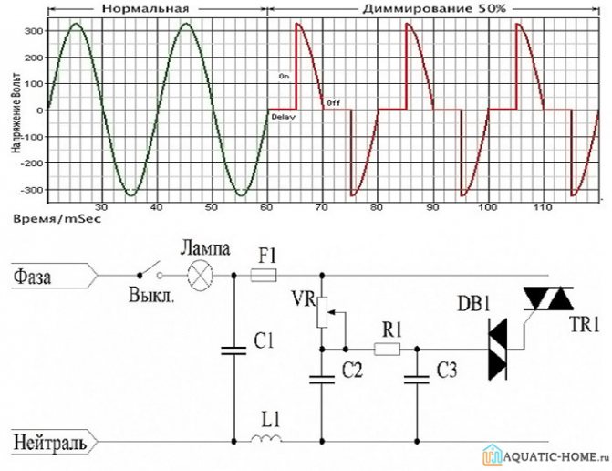 • 1) le chauffage du filament dépend de l'amplitude de la tension qui lui est fournie par le gradateur. En conséquence, sa luminosité change. Ce circuit est utilisé pour les lampes halogènes et les lampes à incandescence (tension de fonctionnement 220 V) ;
