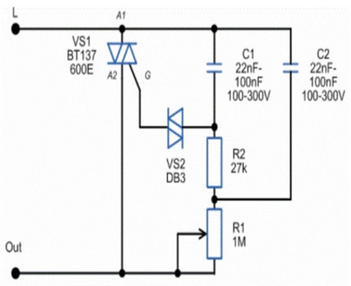 En plus du dinister et du simister, le circuit de gradation simple comprend des résistances - constantes et variables. Avec eux, plusieurs diodes et un condensateur sont également utilisés.