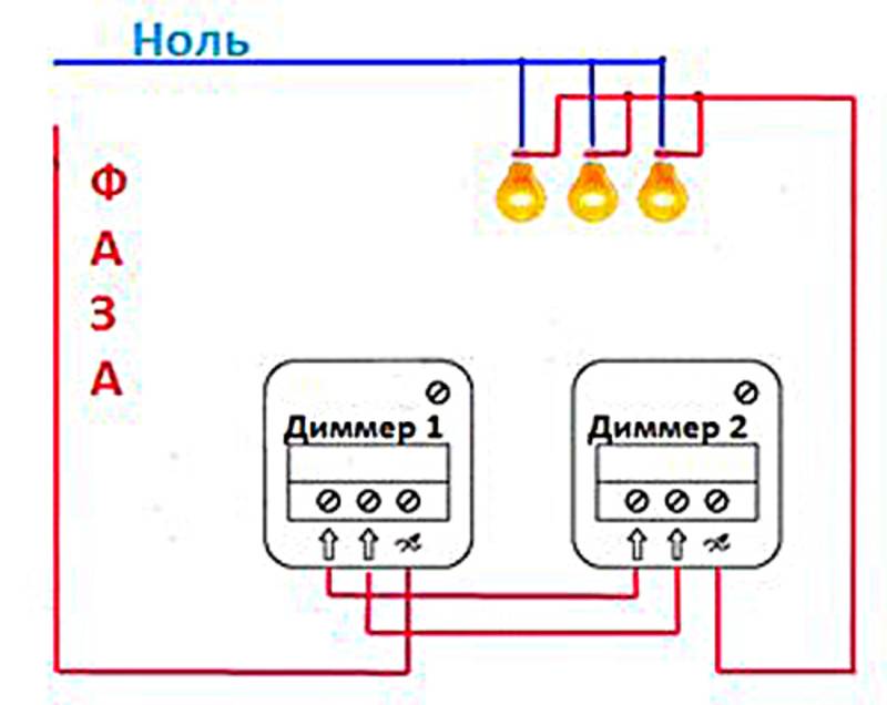• Supposons l'option lorsque la régulation de la lumière est effectuée à partir d'un seul endroit et le contrôle - à partir de deux. Cela peut être un interrupteur à l'entrée et deux régulateurs dans différentes zones de la pièce.