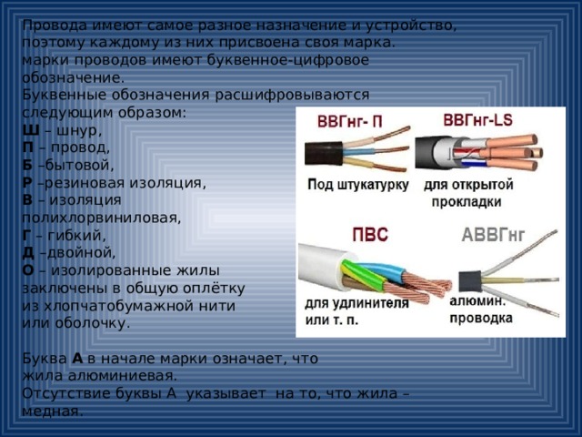 Ces fils électriques et leurs types se distinguent par leur faible coût, leur résistance chimique, leur haut niveau de transfert de chaleur et leur faible poids - ils ont déterminé le caractère de masse de l'électrification dans des conditions industrielles et domestiques pendant plus d'un demi-siècle.