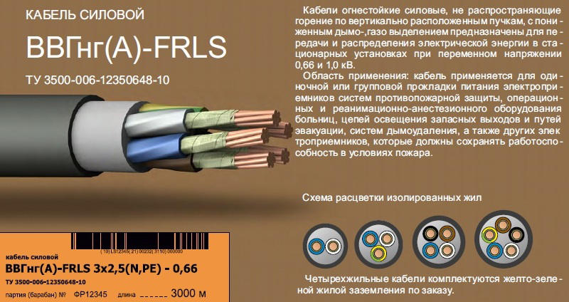 Ce conducteur a deux modifications modernes : avec le préfixe ng-hf - lorsque le câble brûle, il n'y a pas de dégagement de substances gazeuses corrosives ; avec le préfixe ng-ls - lors de la combustion, les émissions de gaz et de fumée sont réduites. Ces deux modifications, à leur tour, ont également leur propre amélioration - fr (résistance au feu). Par conséquent, le produit peut être marqué VVGNG-FRLS. Déchiffrer ce marquage est assez simple une fois que l'on maîtrise le principe.