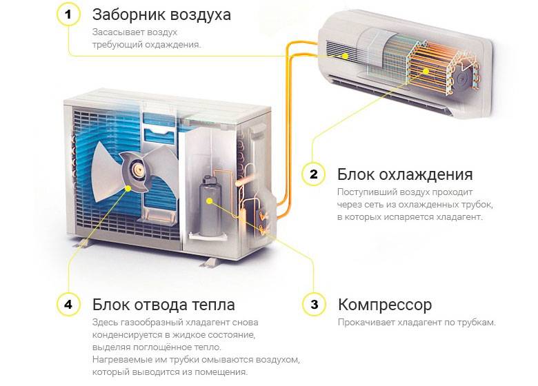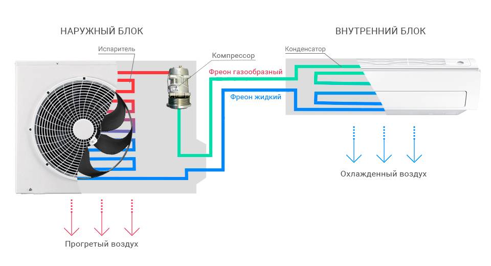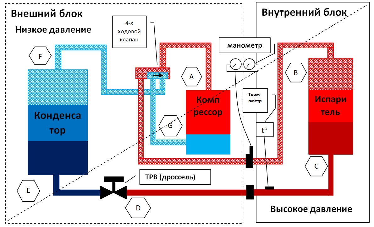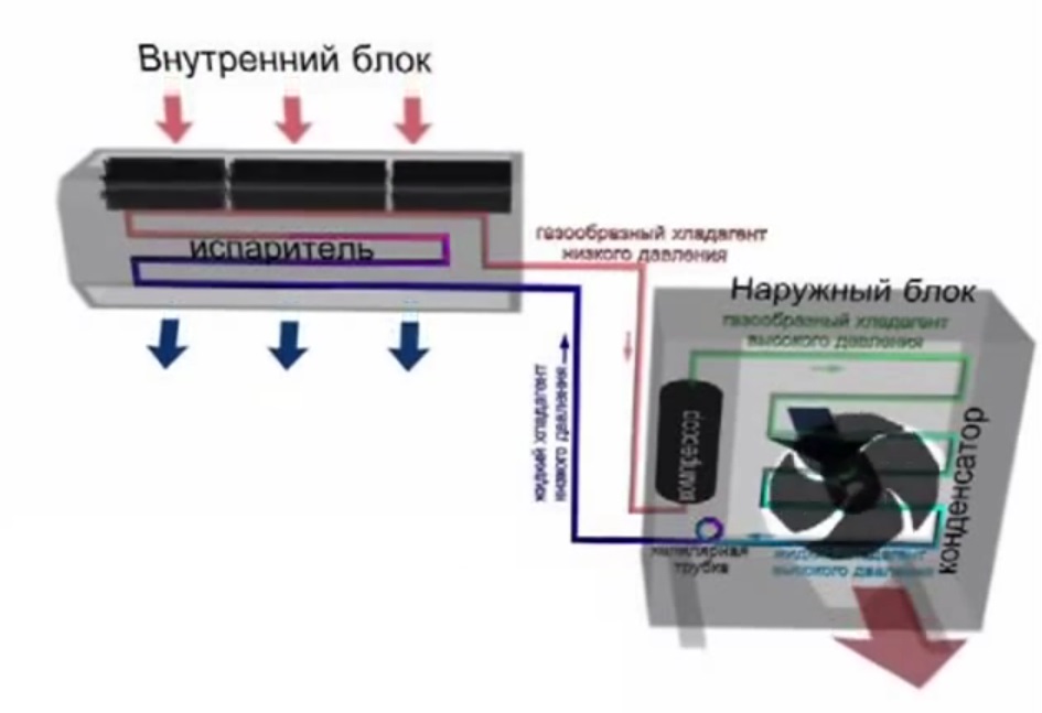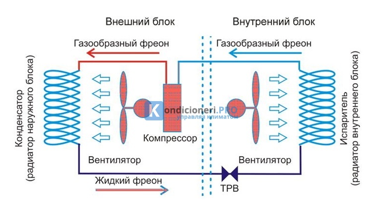 Pendant le refroidissement, le fréon s'évapore, sa condensation se produit dans l'unité distante, après que le réfrigérant comprimé à une certaine consistance quitte le compresseur. Si le fonctionnement du climatiseur ou du système split est réglé pour chauffer la pièce, alors tout se passe dans l'autre sens.