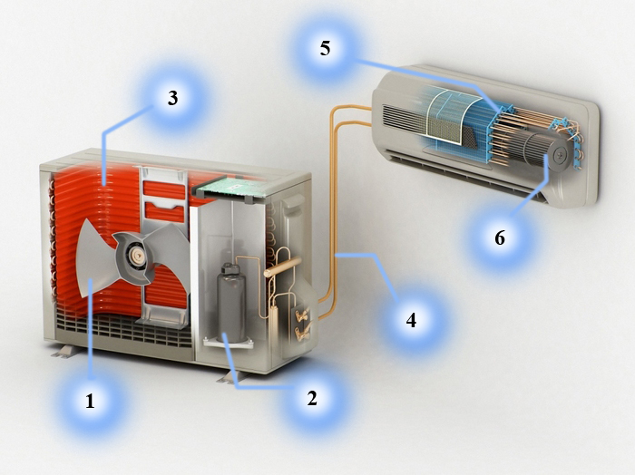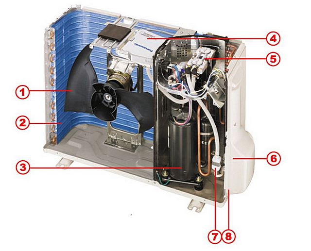 Dispositif d'unité extérieure : 1 - ventilateur ; 2 - échangeur de chaleur ; 3 - compresseur ; 4 - tableau de commande ; 5 - dispositif de protection ; 6 - corps