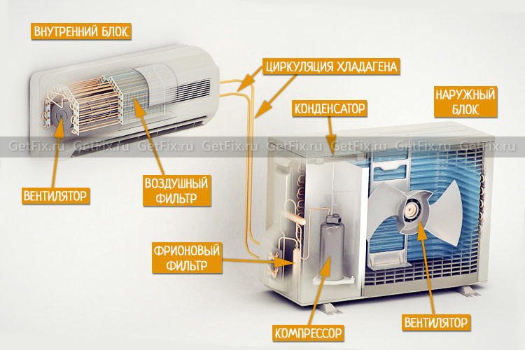 Pour que le processus de fonctionnement d'un tel climatiseur soit effectué efficacement, un certain nombre d'éléments sont utilisés. L'unité extérieure comprend généralement :