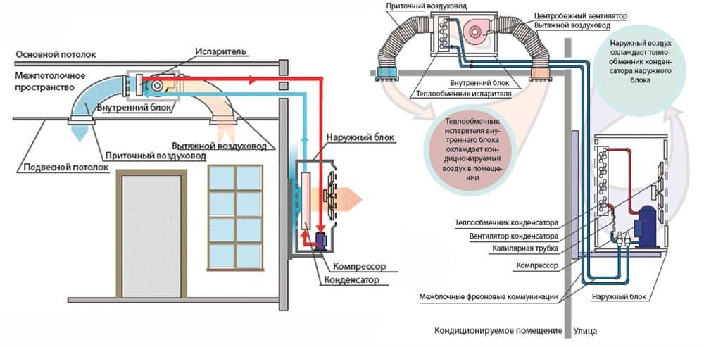 L'installation d'installations de conduits se produit en raison de la fixation de l'unité intérieure derrière le plafond suspendu (il faudra allouer de 30 à 40 cm de la section inter-plafond), l'air est prélevé dans la pièce et revient en passant grâce à des conduits d'air spécialement équipés qui sont fournis presque partout. Un quart de l'air entrant à l'intérieur est un flux frais enrichi en oxygène.