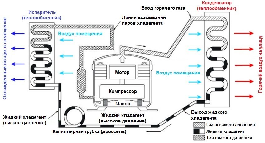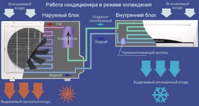 Lorsqu'elles sont chauffées, les substances liquides s'évaporent, absorbant activement la chaleur de la surface sur laquelle elles se trouvent, et lorsque la condensation se produit, le processus inverse se produit - c'est la base du principe de fonctionnement de tout système de climatisation. Ces produits ne peuvent pas produire de froid, mais transfèrent uniquement la chaleur de l'objet refroidi vers la rue ou vice versa, ce qui se produit lorsque le mode chauffage est activé. La chaleur est de l'énergie, et elle ne peut pas disparaître sans laisser de trace ou apparaître de nulle part ; son principal vecteur dans les climatiseurs est le réfrigérant.