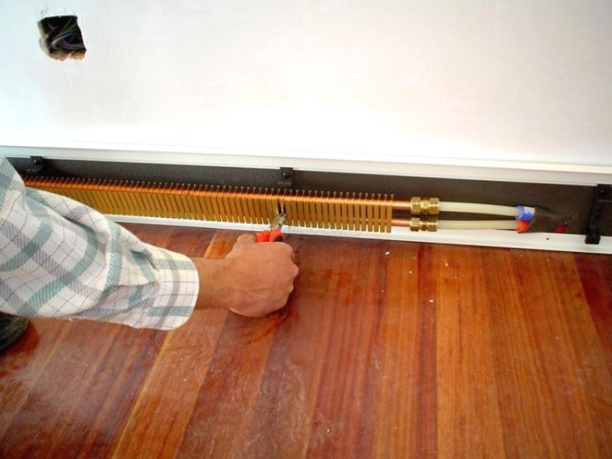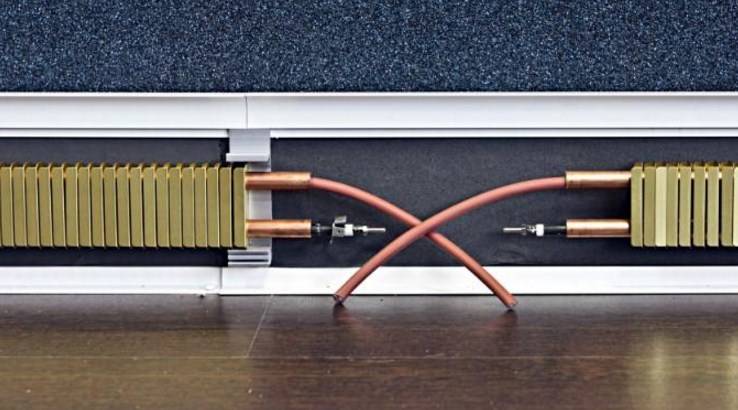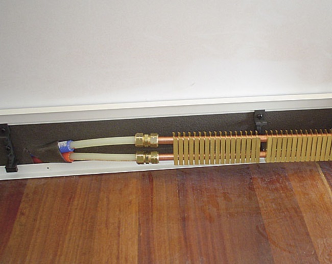 Les tuyaux de chauffage en cuivre sont assemblés autour du périmètre de la pièce en plusieurs batteries connectées en circuit. Le chauffage par plinthe peut être principal et auxiliaire. L'installation à faire soi-même de plinthes chaudes à eau ou électriques coûte moins cher, mais un spécialiste fera mieux.
