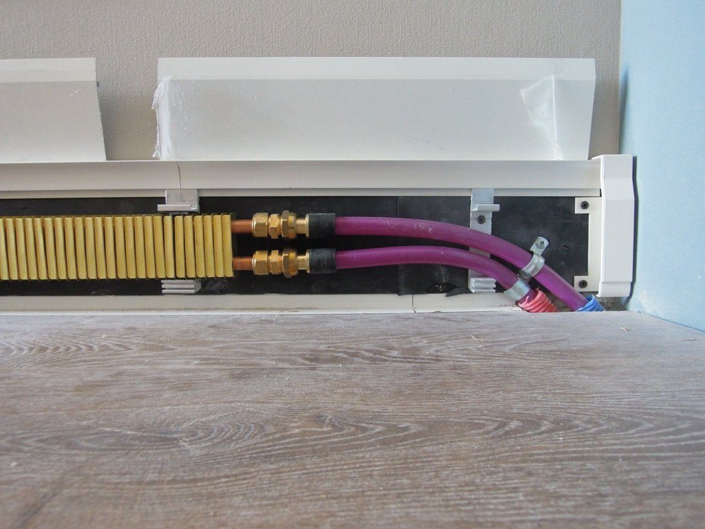 Dans le cas d'une plinthe chauffante à eau, vous devrez poser des tuyaux sur le site d'installation, les cacher dans la chape, puis les connecter à la chaudière de chauffage. Dans le même temps, le chauffage par plinthes de la maison fonctionnera à partir d'un système commun, il devient donc difficile de gérer chacun de ses éléments individuellement.