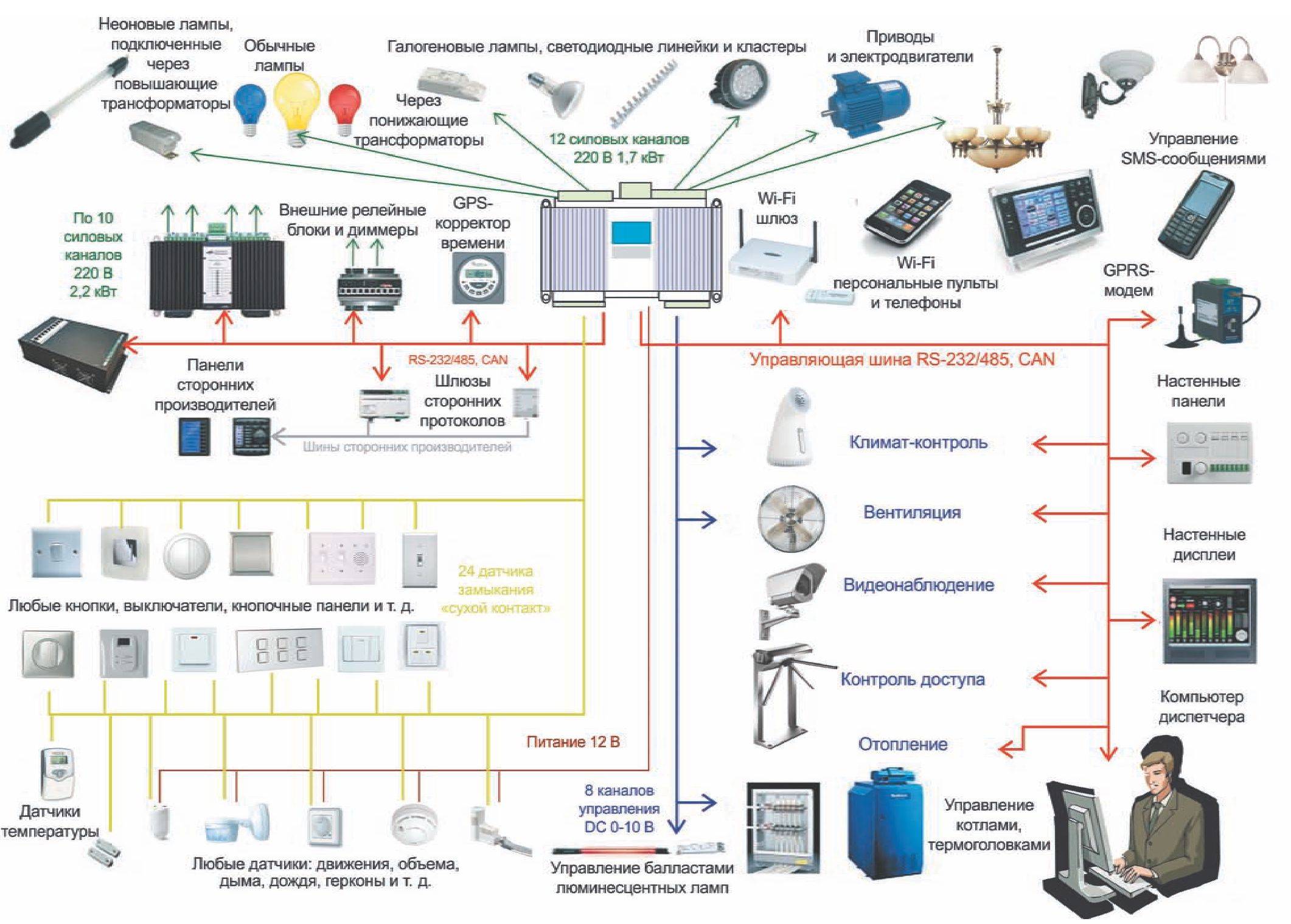 Le contrôleur central d'un système de maison intelligente moderne est un ordinateur enfermé dans un petit boîtier en plastique avec son propre système d'exploitation (système d'exploitation), sa RAM et de nombreux composants électroniques pour commuter (contrôler) les signaux : relais électroniques, clés terristor, etc.