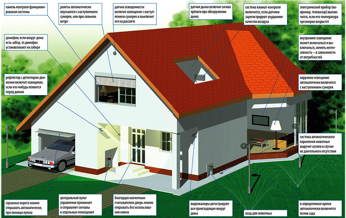 Un bâtiment intelligent en lui-même implique un immeuble de bureaux ou de commerce économe en ressources, qui consomme pratiquement et correctement toutes les sources d'amélioration de la vie utilisées. Maison intelligente - approvisionnement en chaleur, énergie électrique et plus, ainsi qu'un impact modéré sur l'environnement extérieur.