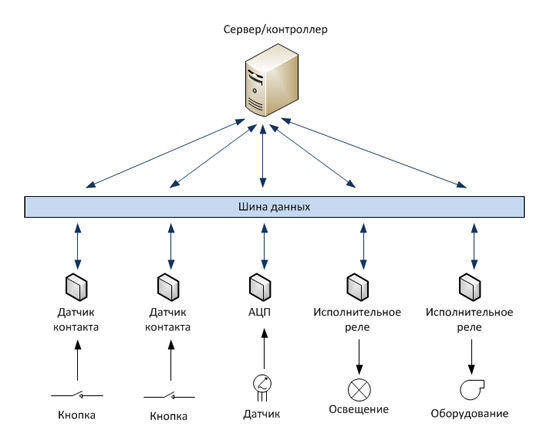 Centralisé. Toutes les informations sont collectées dans un module logique. Son rôle est souvent assuré par le contrôleur, qui dispose d'un grand nombre d'entrées.Un programme y est écrit, à l'aide duquel les appareils sont contrôlés. Cette conception vous permet de créer des scénarios complexes pour le fonctionnement des équipements.