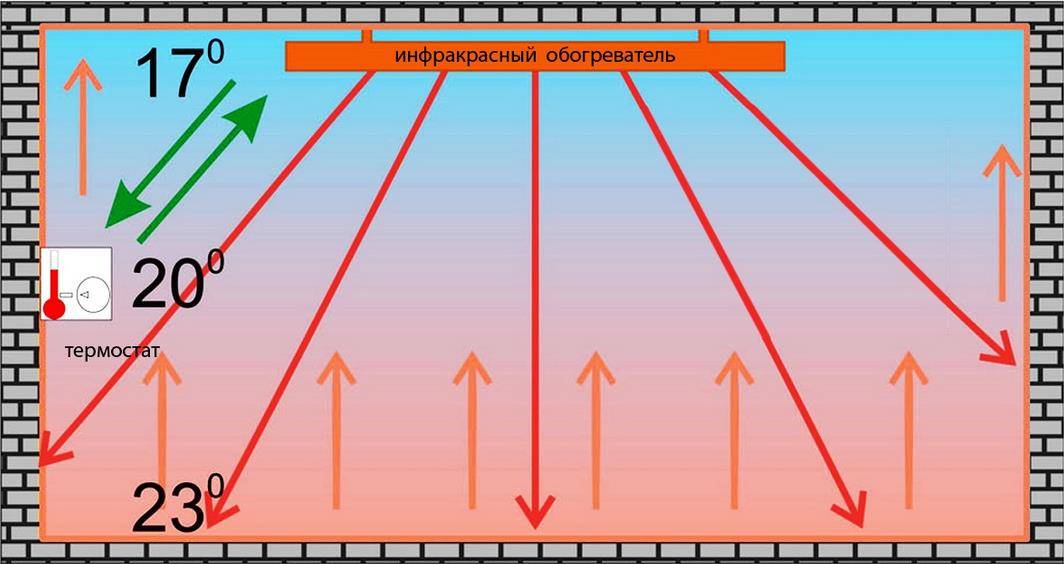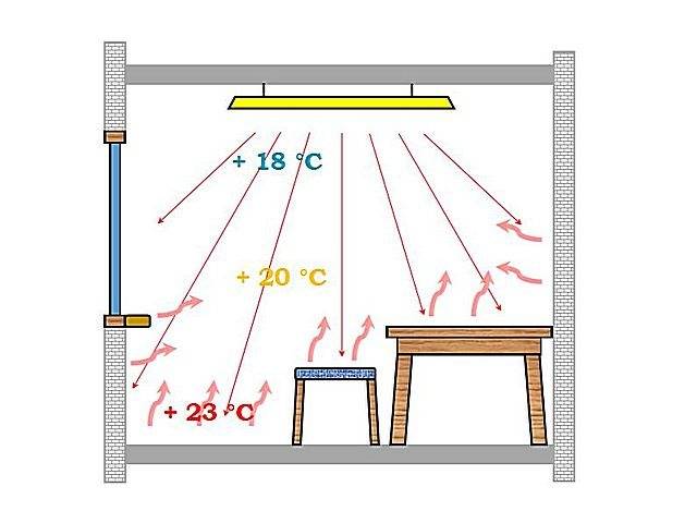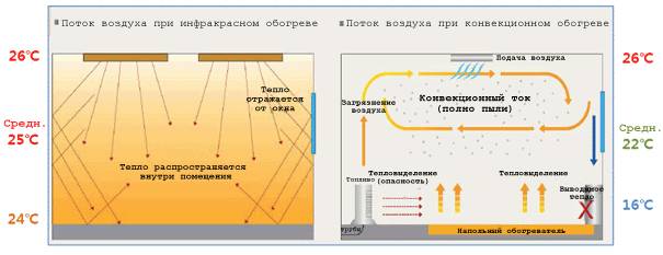 Si vous vous souvenez pourquoi les radiateurs traditionnels ne sont pas placés près du plafond, la préférence doit être donnée au système reproducteur, car il donne également de la chaleur par le bas, en faisant circuler des masses d'air. Mais tout n'est pas si simple: les radiateurs à eau chauffent l'air, et le film chauffe les objets et les personnes, et d'eux l'air. Par conséquent, avec le chauffage infrarouge, il n'y a pas de mouvement aussi rapide des flux d'air, ce qui signifie que la pièce est chauffée de manière inégale.