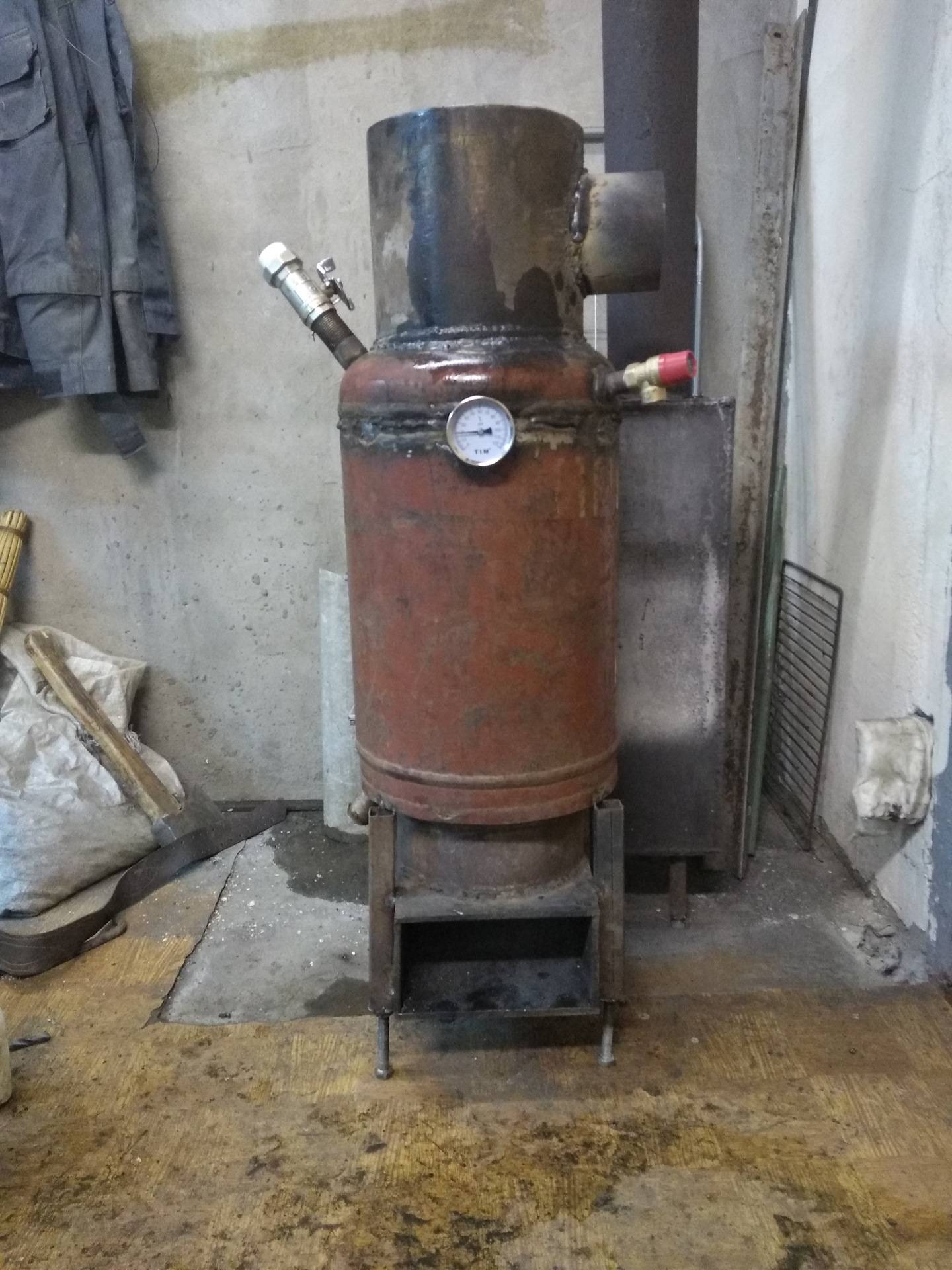 Le fond inférieur est solide, il est important de ne pas le confondre. Un tuyau de postcombustion est soudé dans le réservoir supérieur en bas et un tuyau pour la cheminée du four en haut