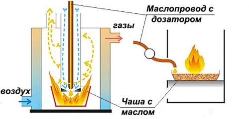 Une cheminée doit être installée, sinon le poêle du garage ne peut pas être utilisé. Les impuretés de l'eau ne sont pas autorisées dans l'huile.Tout d'abord, versez une petite portion, quelques litres. Ensuite, à l'aide d'une mèche en papier, l'huile du réservoir est enflammée. En ouvrant ou en fermant l'amortisseur, une traction stable est obtenue. Après 2-3 minutes, le poêle se met en marche, l'huile bout. L'appareil est prêt à l'emploi.