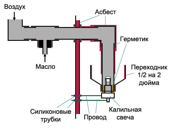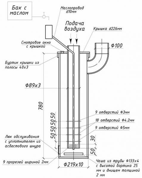 Près de la surface du fond du brûleur, un tuyau d'échappement et une unité doivent être coupés qui fourniront de l'oxygène à l'intérieur, car sans cela, le processus de combustion ne sera pas soutenu.