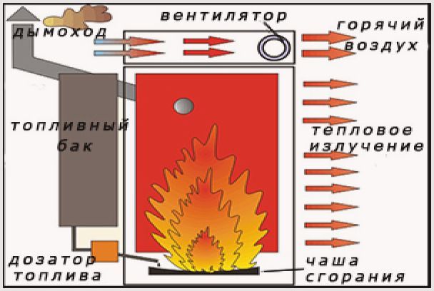 1. Avec chauffage direct. Cela signifie que l'air traversant le tuyau est chauffé par les parois de la chambre et mélangé aux produits de combustion qui en sortent, puis le mélange de gaz pénètre dans la pièce. Le radiateur est très efficace, mais ne convient pas pour travailler dans des espaces confinés.