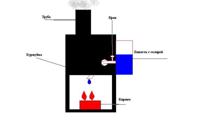 Pour limiter le débit de substance combustible du réservoir la sortie est équipée d'une vanne spéciale. Du gaz kérosène du four a obtenu un brûleur, alimenté par du carburant diesel. Cet élément est une mèche fiable, dont la partie inférieure est immergée dans un réservoir de carburant.