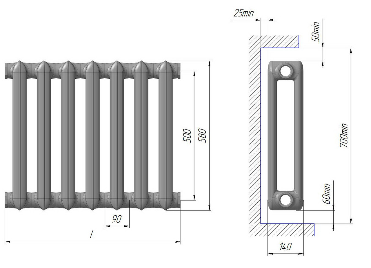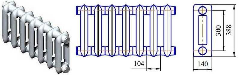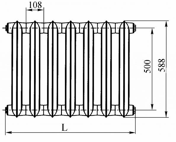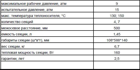 Radiateur en fonte - type sectionnel à deux canaux. La section a une longueur de 93 mm, une hauteur de radiateur de 588 mm et une profondeur de 140 mm. Une section a une surface de chauffe de 0,244 m2, le flux de chaleur nominal est de 0,160 kW. Une section a une capacité de 1,45 litre. et poids, compte tenu des tétines et des bouchons, 7,1 kg. Le trou du mamelon est fileté - G1 1/4.