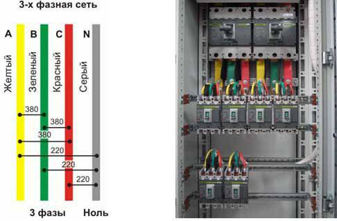 Le neutre N (c'est le point de connexion commun des enroulements du générateur connectés en étoile) est toujours bleu ou bleu clair. Toutes les autres couleurs sont utilisées pour le marquage des phases, à condition qu'elles ne puissent pas être confondues avec les fils zéro et terre, même dans de mauvaises conditions d'éclairage. C'est-à-dire que les couleurs contrastées sont préférées :