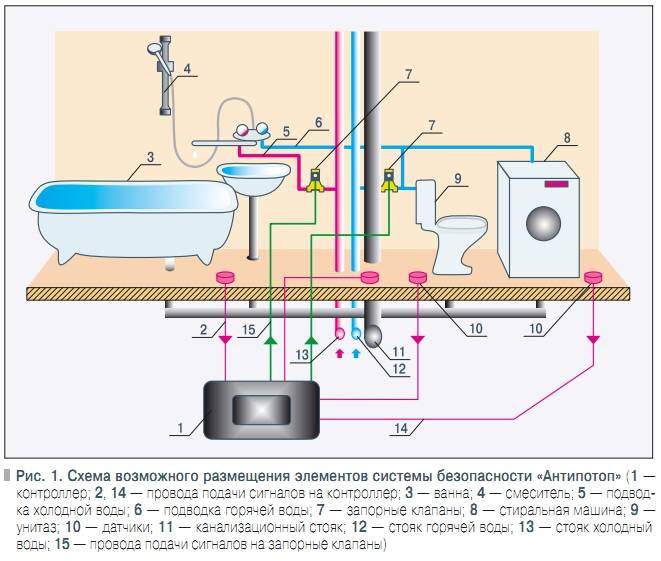 Le chauffage complète le tableau. Dans les maisons anciennes, ils nécessitent également un contrôle. Sortie - devant chaque batterie, vous devez placer une vanne d'arrêt automatique avec un capteur d'inondation.